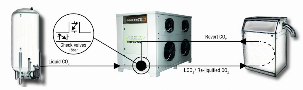 Samlar in “återvändande” gas, som vanligtvis slösas bort under torrisproduktion, omvandlar den till flytande CO2 och återbördar den till pelletiseraren. Du kan därmed använda din gas två gånger och detta kan halvera kostnaden för torris!