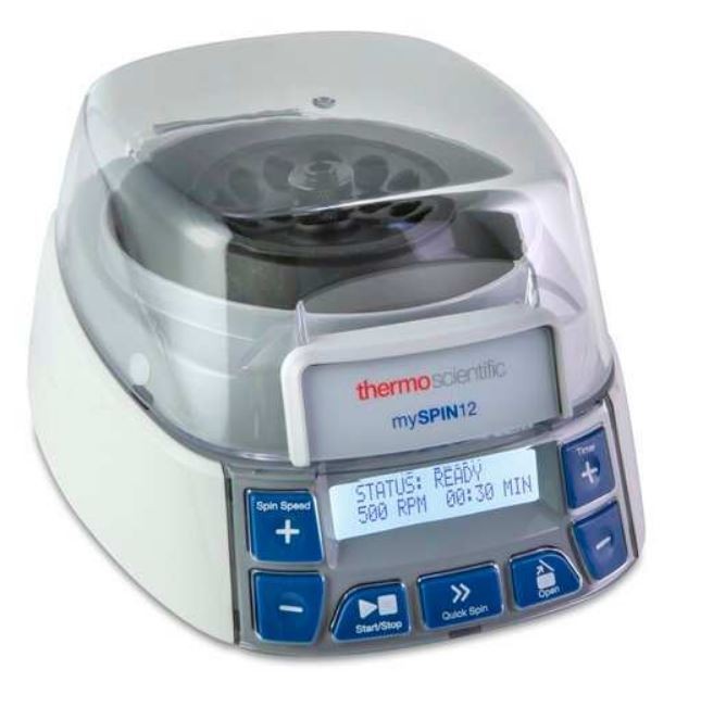 - mySPIN 12-centrifugen är idealisk för de flesta applikationer som kräver snabba snurr (12 500 rpm/9 800 x g) och lämplig för PCR, mikrofiltercellseparation och HPLC-protokoll
